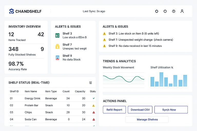 Manual tracking and barcode systems leave gaps. Our AI-driven shelf sensor system gives you a real-time, accurate view of what’s on every shelf — 24/7.